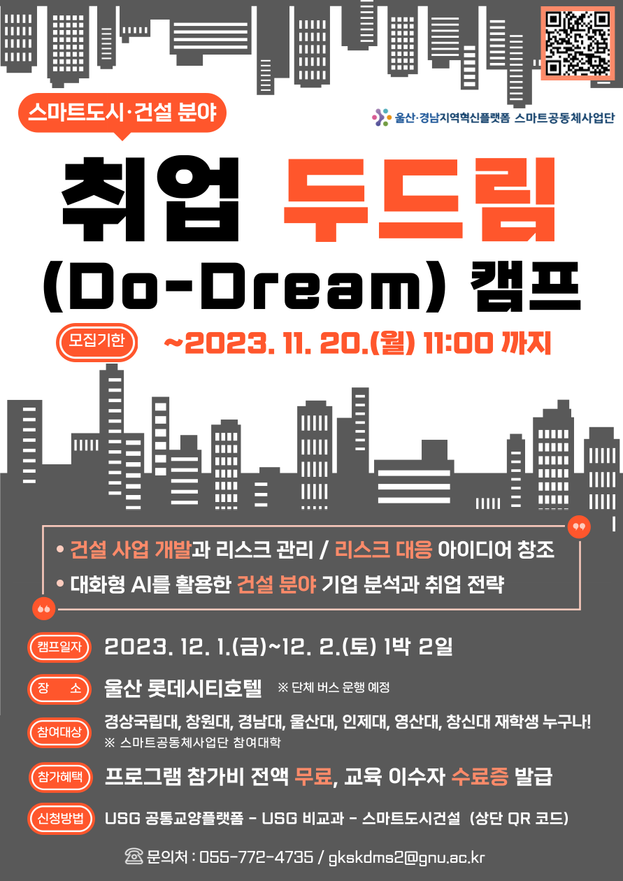울산·경남지역혁신플랫폼 스마트공동체사업단에서 참여대학 학생들의 직무역량 및 창의적 문제해결능력 향상을 위해 취업 두드림(Do-Dream) 캠프 참여자를 모집합니다. 가. 프로그램 개요 1) 프로그램명: 스마트도시·건설 「취업 두드림(Do-Dream) 캠프」 2) 교육기간: 2023. 12. 1.(금) ~ 12. 2.(토), 1박 2일 3) 장 소: 울산 롯데시티호텔 세미나실 4) 주요내용 - 건설 사업 개발과 리스크 관리 - 대화형 AI를 활용한 건설 분야 기업분석과 취업 전략 나. 학생 모집 1) 모집기간: 2023. 11. 20.(월) 11:00까지 2) 모집대상: 울산·경남지역혁신플랫폼 스마트공동체사업단 참여대학 재학생 ※ 경상국립대, 창원대, 경남대, 울산대, 인제대, 영산대, 창신대 3) 모집인원: 20명 ※ 모집 인원 초과시 우선순위에 의한 선발([붙임1] 참조) 4) 신청방법: USG 공통교양플랫폼을 통한 신청(https://eclass.usg.ac.kr/courses/653612586f0d8b572a0932fd) 5) 제출서류:【붙임1】참가신청서 및 재학증명서 각 1부 6) 선발발표: 2023. 11. 21.(화) 사업단 홈페이지 게시 7) 문의처: 055-772-4735