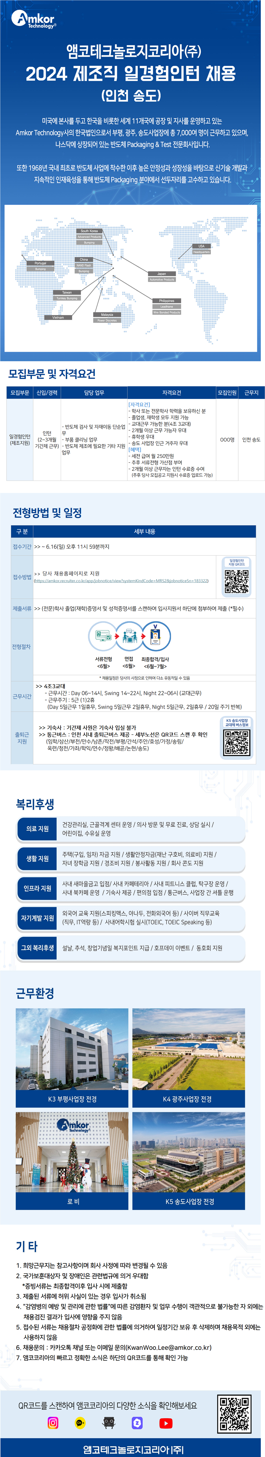 | [앰코코리아] 2024 제조직 일경험인턴(학사/전문학사) 채용 (인천 송도) (~6/16) | |||||