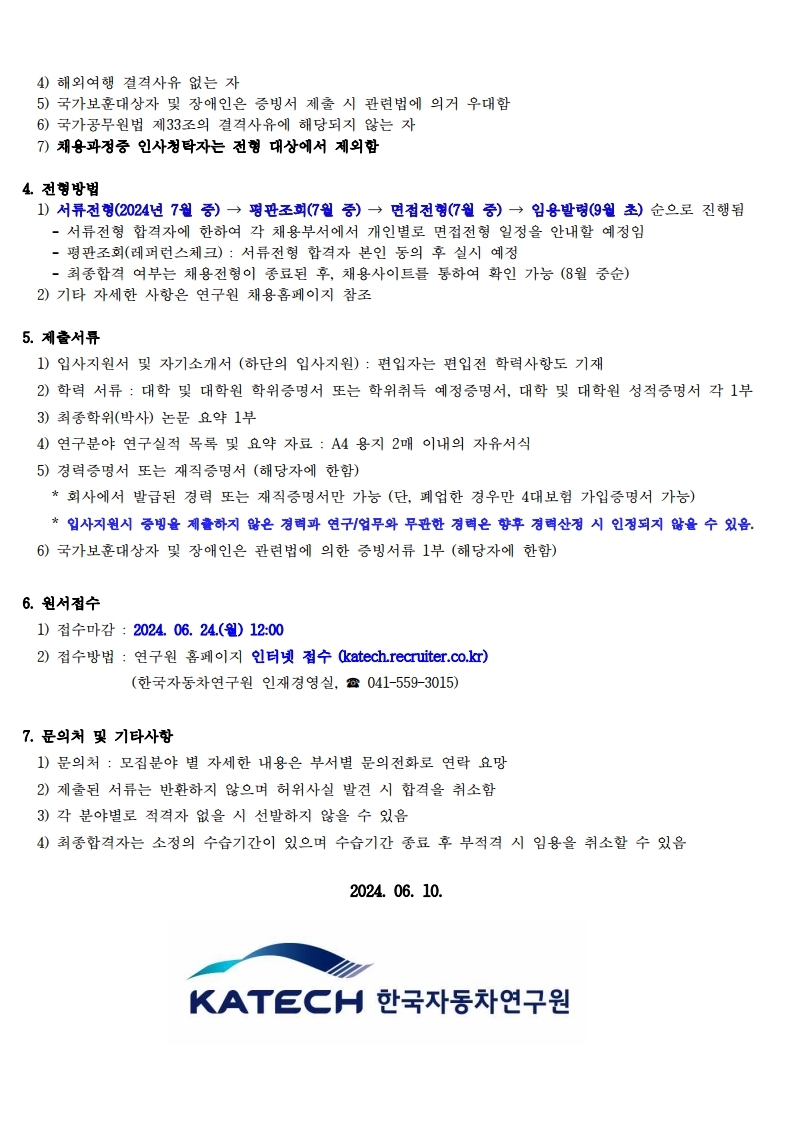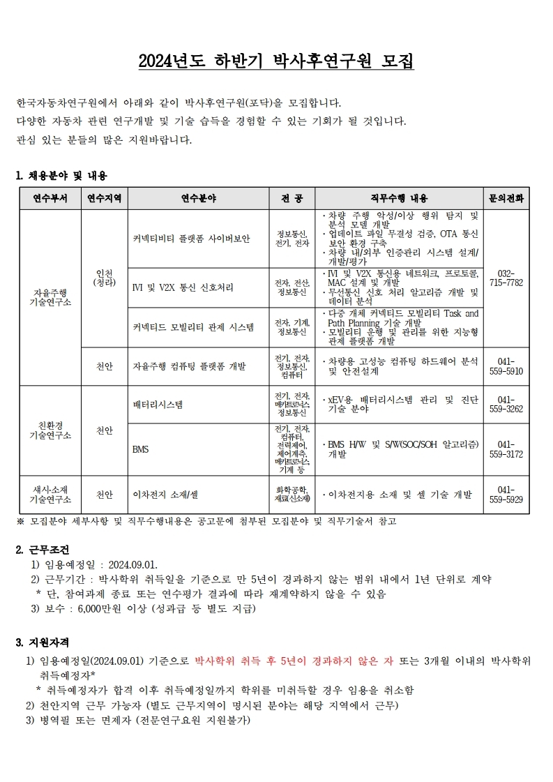 [한국자동차연구원] 2024년도 하반기 박사후연구원 모집 공고 (~6/24 12시)