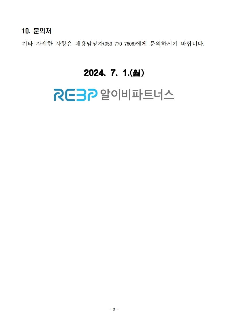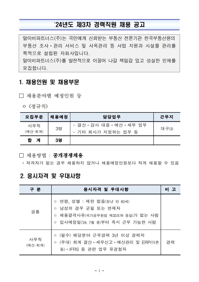 | [한국부동산원 자회사] 알이비파트너스(주) '24년도 제3차 경력직원 채용 공고 (~7/10) | |||||